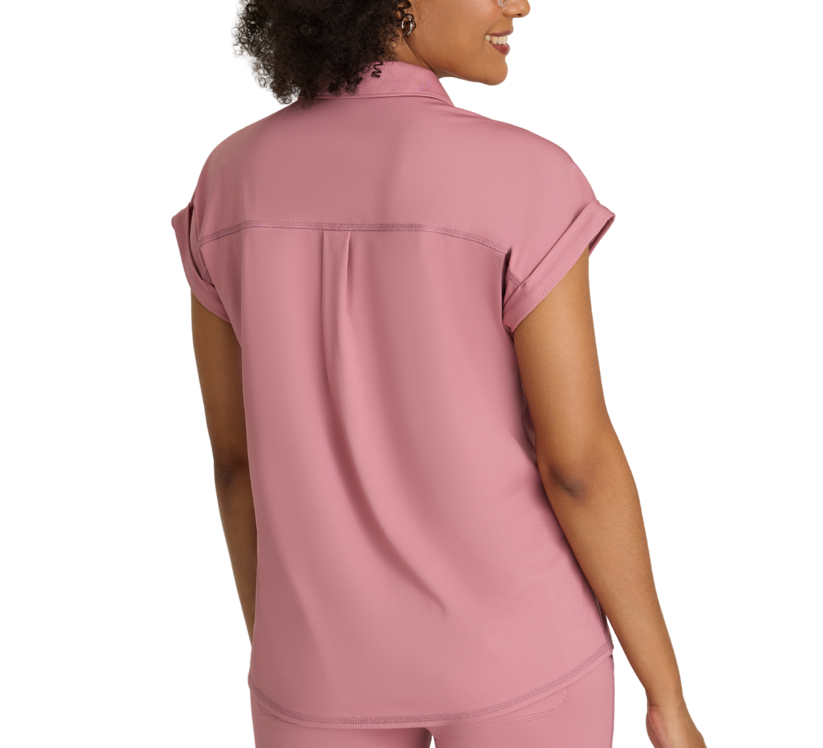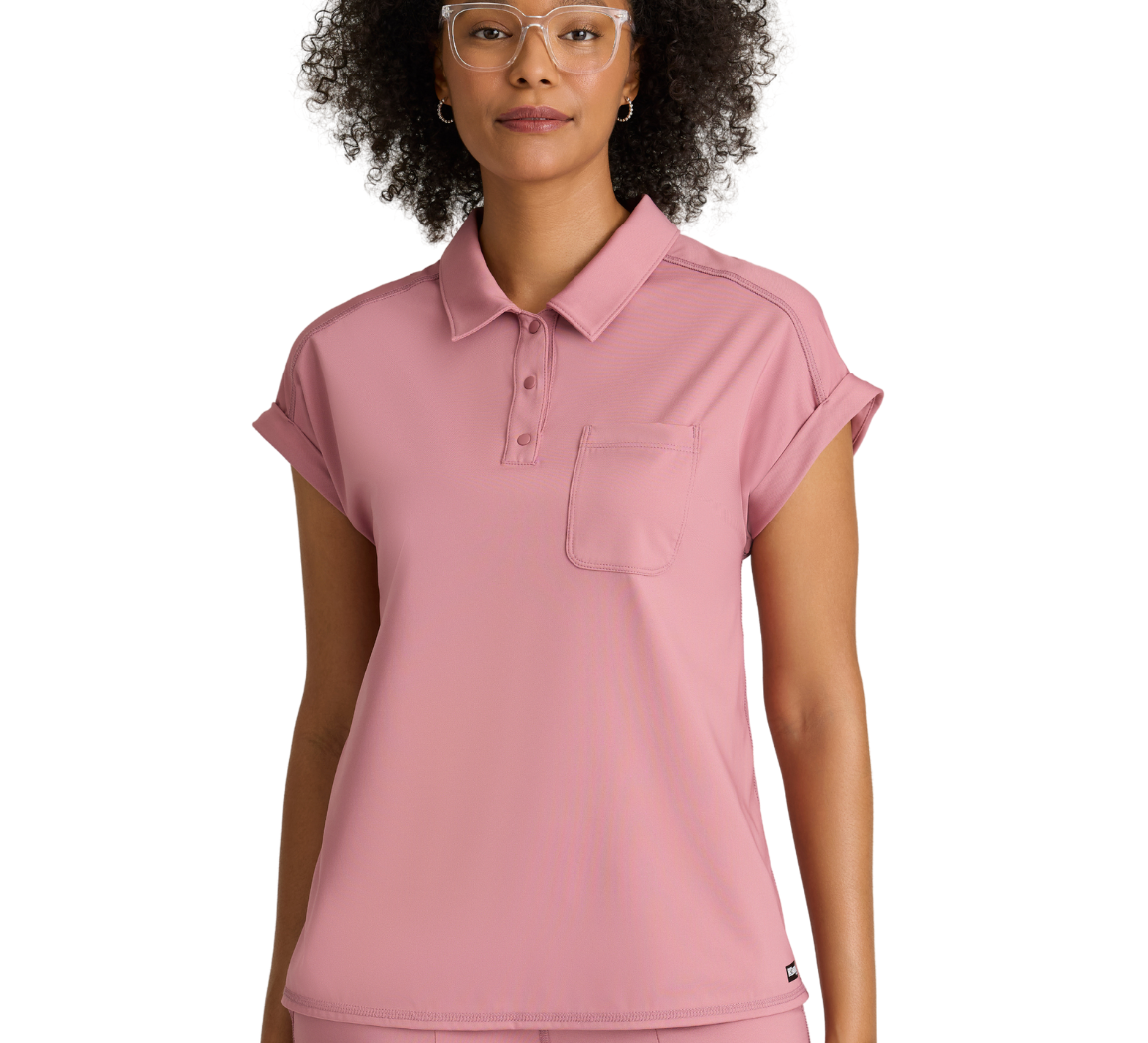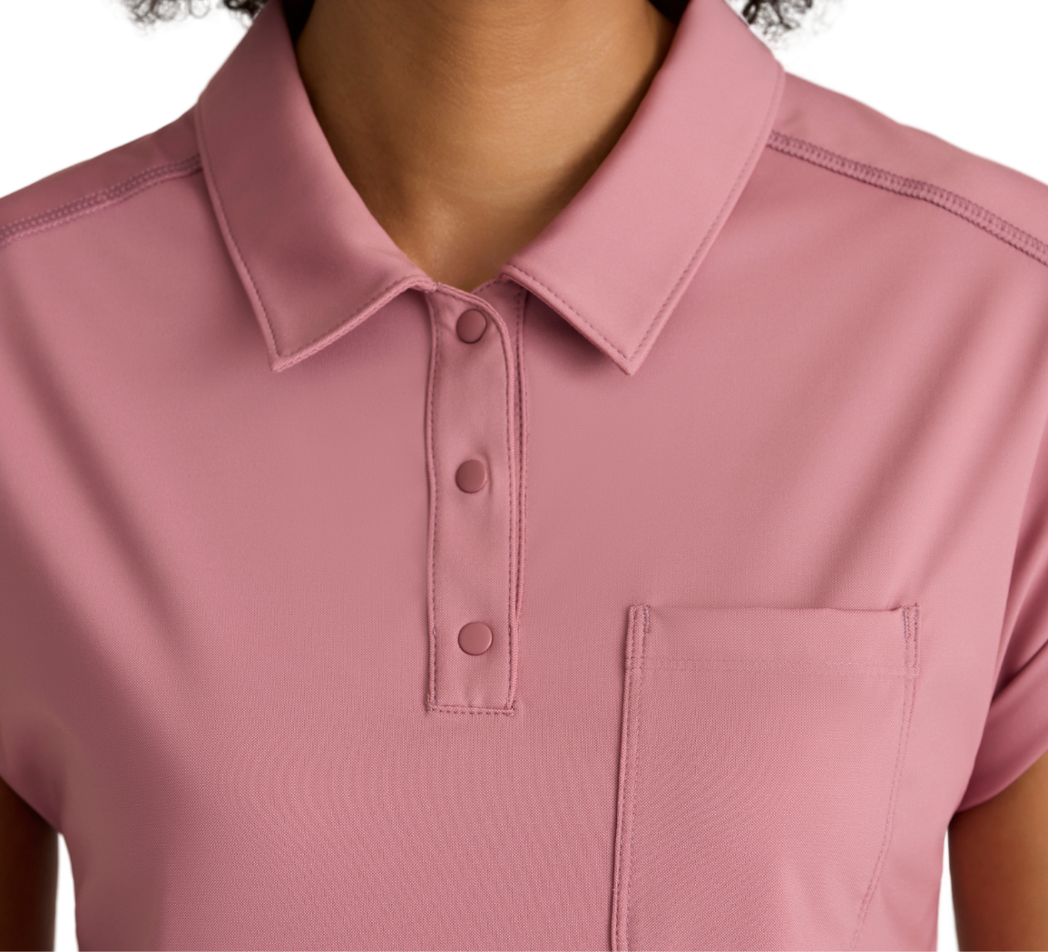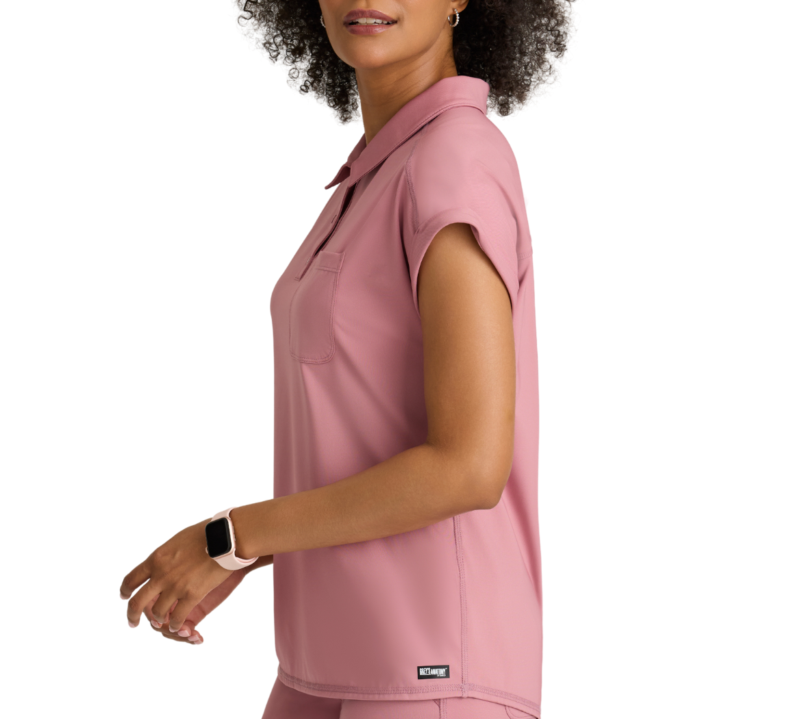 Anatomía de Grey™ de Barco Knit Stretch, El top de punto Renew cuidadosamente diseñado cuenta con un bolsillo en el pecho para guardar cosas fácilmente, un elegante cuello con tapeta a presión y elegantes mangas dolman para un toque de estilo. El canesú trasero con pliegues rectos garantiza libertad de movimiento, mientras que el dobladillo ancho, de corte alto, ofrece una silueta moderna. Confeccionado con un acabado antimicrobiano para combatir el moho y los hongos.